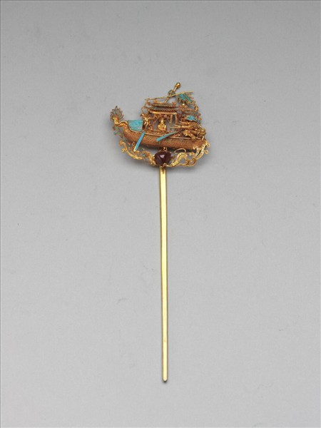 金簪,簪首為一纍絲龍舟載浮於海浪之上,龍舟上乘涼亭與人物,屋瓦及海浪部分飾有點翠,浪中嵌紅寶石一,鋌素直。此器與故雜4693為一對。