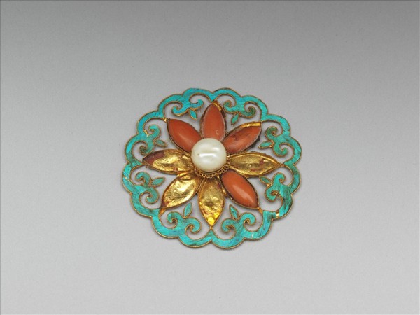 團形鈿花,正中為八瓣菱花,每瓣皆嵌珊瑚,花芯嵌珍珠,周身環繞鏤空點翠三出葉紋。鈿花又稱「面簪」,裝飾於滿族婦女在節慶祭祀時穿戴的彩冠「鈿子」上面,常以數個鈿花單件合成一組。