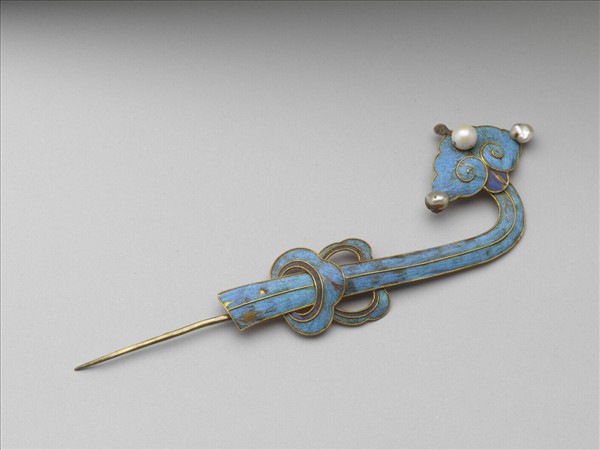 金簪,點翠如意簪首,簪頭彎曲略呈90度,雲頭部分嵌有三顆珍珠,鋌素直。