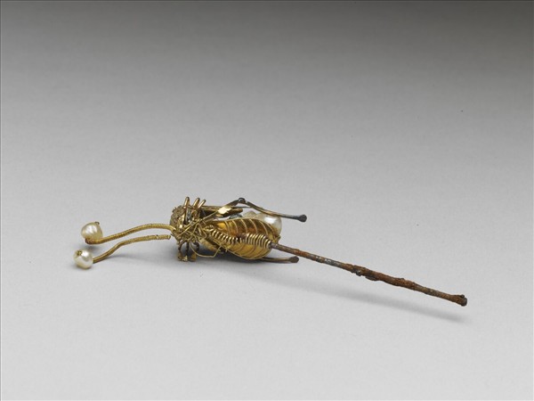 髮簪,簪首為纍絲螽斯,尾部及觸鬚頂端串有珍珠,鋌部素直。此器與故雜4706為一對。
