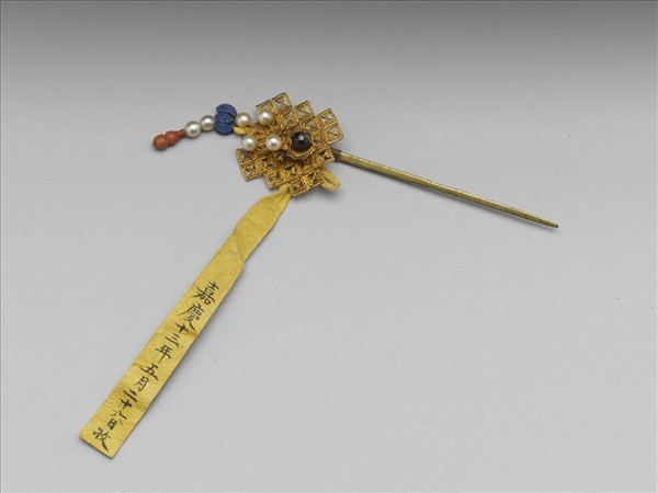 金簪,由纍絲方塊組成之幾何圖形為簪首,上方停有一嵌藍色寶石的蜘蛛,簪首頂端懸掛流蘇,雕青金石蝙蝠,珍珠二顆與葫蘆形珊瑚珠。