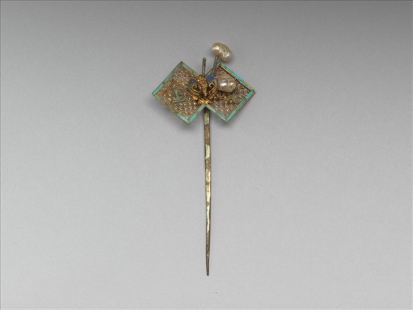 金簪,簪首為纍絲方勝,邊緣點翠,方勝上纍絲蝙蝠一,彈簧觸鬚頂端串珍珠,鋌素直。