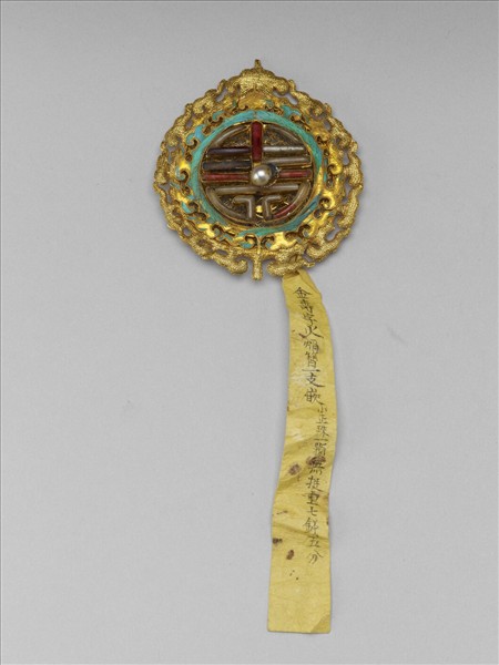 火焰形面簪,纍絲朵花錦座,中心為嵌玉團壽字,正中嵌珍珠,壽字外繞兩圈火焰紋,內圈點翠,外圈為纍絲。