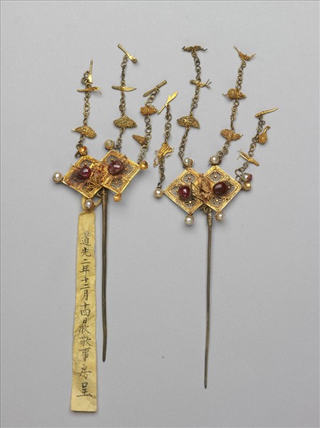 金簪一對,簪首為纍絲方勝,上嵌紅寶石,方勝頂端處皆嵌珍珠,上方珍珠懸掛金屬鍊,串葫蘆、寶劍等佛教器用金屬飾片。素鋌。