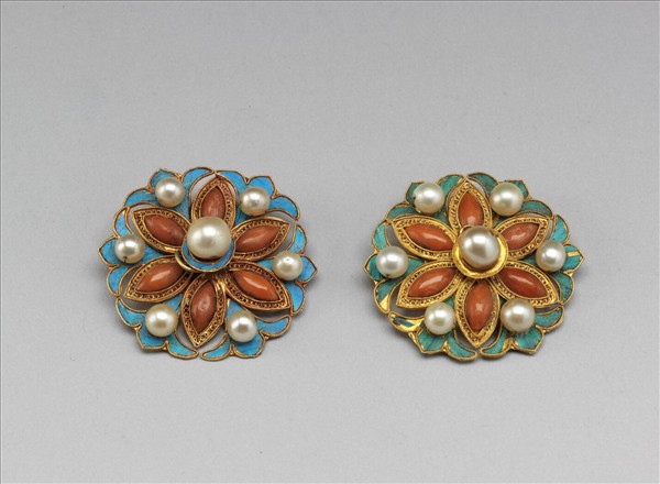金結子兩件,器身略呈團形,分上下兩層,上層為六瓣纍絲菱花,瓣嵌珊瑚,下層為瓣間延伸的三出葉紋,花芯及葉上皆嵌有珍珠。