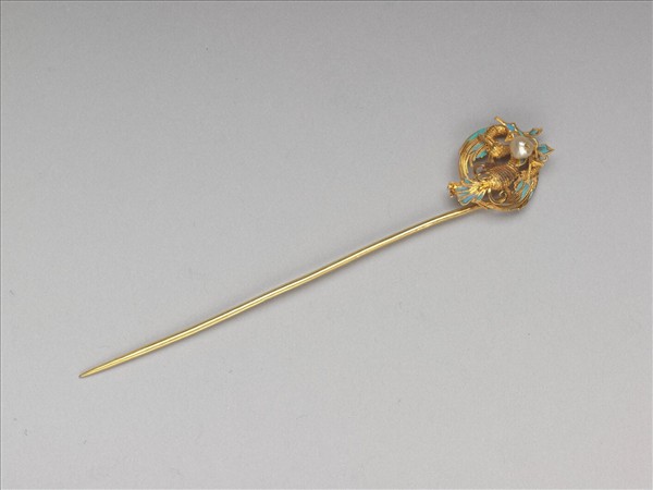 金簪,簪首為鶴,展翅貌,點翠羽,頭嵌珍珠一,素鋌。