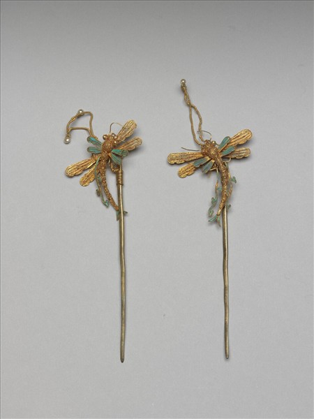 金簪一對,纍絲蜻蜓簪首,點翠翅,蜻蜓頭部兩條彈簧觸鬚,頂端穿珠;素鋌。