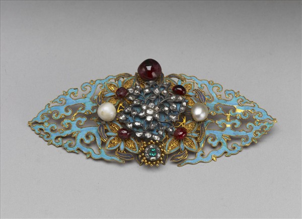 長棱形。鏤空雲紋座,飾以點翠。正中突出三層,第一層纍絲花四朵,緣及葉點翠嵌紅寶石四、珠二;次層點翠嵌玻璃;最上層呈花蕊式,嵌玻璃。黃籤:乾隆四十二年十二月初一日(1778)。