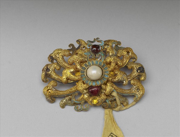 鈿花,略呈橢圓形,中心為嵌珍珠菊花,花朵上下嵌紅色寶石,左右延伸兩層纍絲如意,如意頭嵌珍珠。鈿花又稱「面簪」,裝飾於滿族婦女在節慶祭祀時穿戴的彩冠「鈿子」上面,常以數個鈿花單件合成一組。