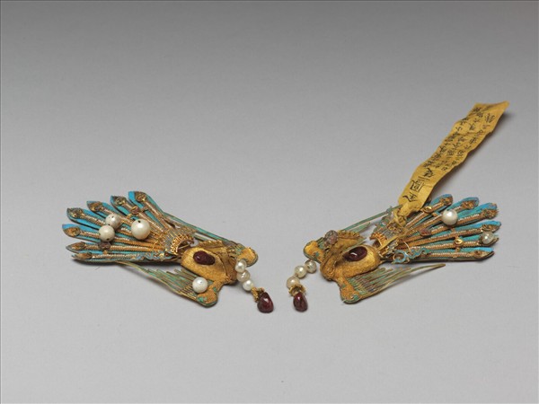 金鳳一對,身嵌紅寶石,羽毛點翠,尾巴緝珠,嘴部垂流蘇,貫珍珠與紅寶石。