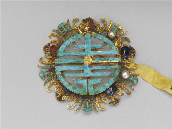 金面簪,略呈圓形,中心為點翠團壽紋,外圈飾點翠嵌珍珠長壽字與纍絲嵌寶石蝠紋。
