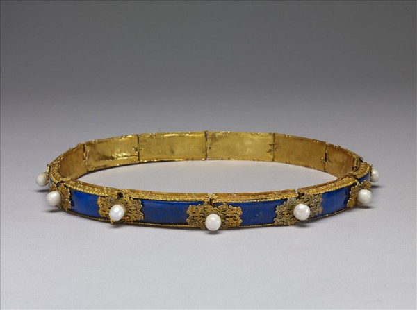 金約是皇太后及其下各級妃嬪、命婦於典禮儀式使用之圓弧形頭飾。圍繞頭額佩戴,結貫珠垂帶於後方。鑲嵌材質、珠飾數量、垂帶形制依身分等級有所不同,嵌青金石及東珠者,屬嬪妃以上等級。院藏十二節金托連結而成的青金石金約,尚留有道光十三年(1833)墨書黃籤。兩節之間鑲纍絲金雲及珠粒各一。與《皇朝禮器圖式》記載,皇貴妃、貴妃金約「飾東珠十有二」之規制相符。