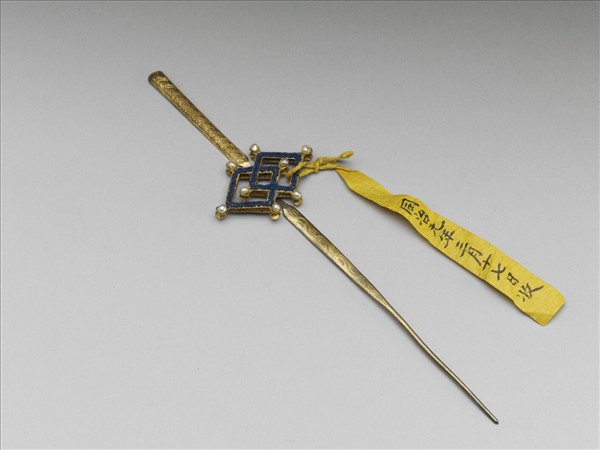 銀鍍金尖鋌簪,簪鋌上刻有簡單之波曲紋與類卍字紋錦地之紋飾,簪首作方勝,方勝面上嵌飾深藍色之米珠,方勝銳角尖端處飾珍珠。