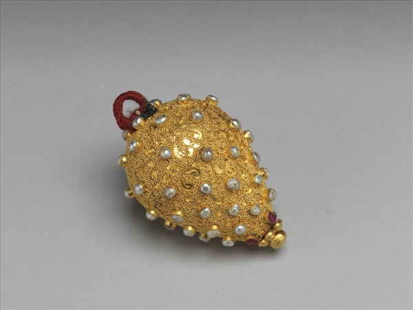包金鈕子,略近錐形,一端有環,其表面包飾細魚子地雲紋,並嵌珍珠,珍珠大致等距布列於鈕面,近錐狀尖端處並有嵌紅寶石,金碧輝煌中不只襯出柔和的珠白,其間紅寶石更是亮眼。