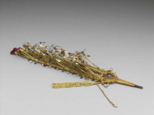 包金嵌珠石花,如劍把的金屬厚片衍出兩股平行挺直金屬條,有如一把鑲嵌許多寶石的雙股劍,整器便以此為支架,包嵌細細的金屬枝葉與珠石花,花葉數量多,表現出蓬勃繁密的生意,各色珠石花點綴其中,更為亮眼。