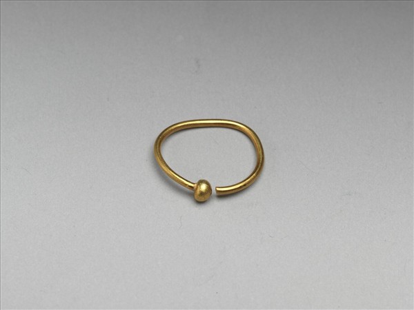 金質環形器,猶如將一段鐵條拗彎為圓而成,其一端焊黏一球狀金屬,兩端並未接合,可能是方便調整環徑大小。外壁光素無紋,該器或為今日之耳環。