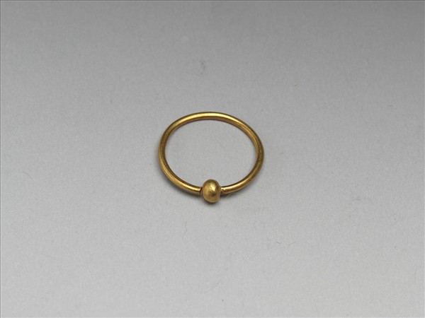 金質環形器,猶如將一段鐵條拗彎為圓而成,其一端焊黏一球狀金屬,兩端並未接合,可能是方便調整環徑大小。外壁光素無紋,該器或為今日之耳環。
