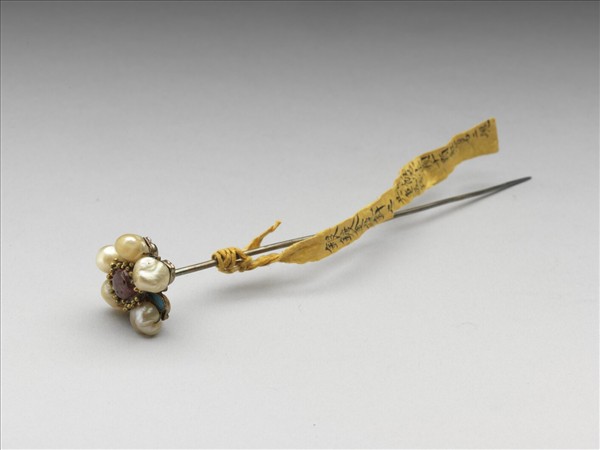 銀鍍金素鋌,簪首部份作盛開花一朵,花中央嵌紅色寶石為蕊心,蕊心四周金屬花蕊圍拱,花瓣除點翠為飾外,嵌珍珠。院藏一式兩件,故雜4813~4814成對。
