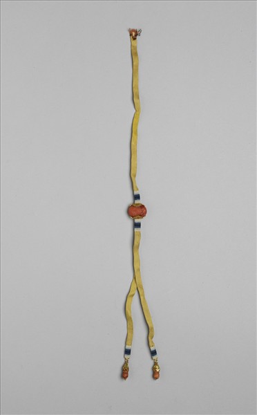 全器以一塊近橢圓的珊瑚為主體,上方接一黃色絲帶。下方所接之兩條黃色絲帶,又接有兩塊小珊瑚為墜角。整器素雅柔和。