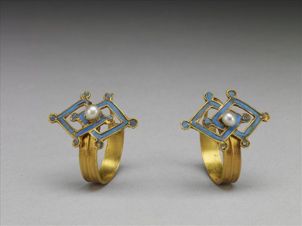 耳環。環面作點翠方勝,正中嵌珠一,下部作半環狀,弦紋三道。