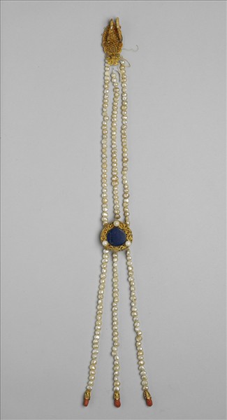 金鑲青金石垂掛,以一塊略近桃形的鍍金金屬飾片為主體,飾片邊框鏨雕卷枝花葉,並等距鑲飾珍珠三顆。飾片下垂三串珠鍊,並有珊瑚墜角。飾片上方則以三串珠鍊與另一略近葉形的金屬飾片相接。