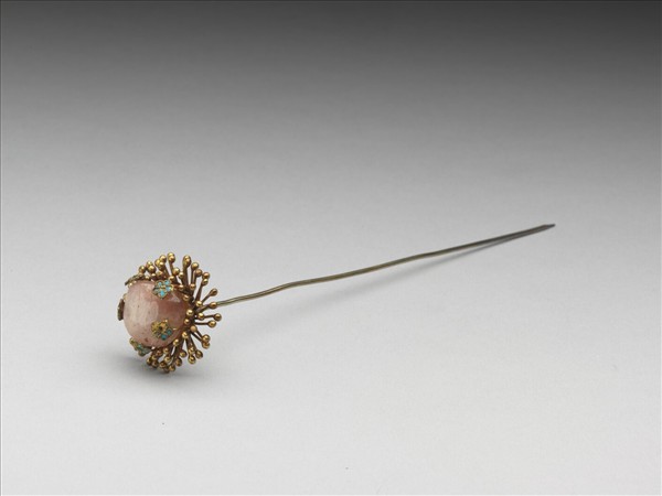 銀鍍金素鋌簪,簪首作金屬花蕊圍拱粉紅色碧璽花心之狀。