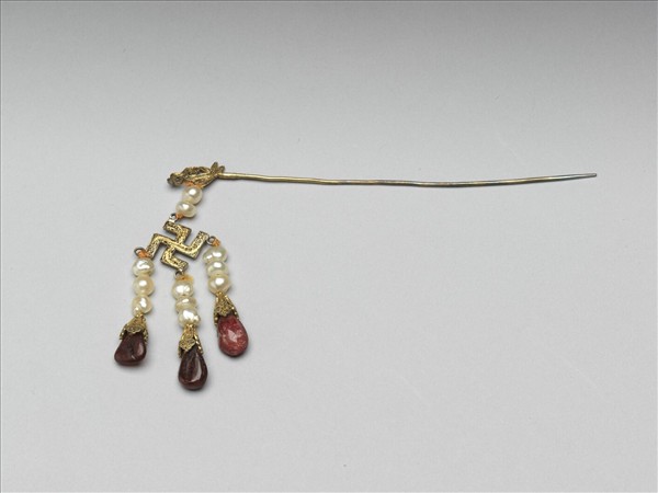 銀鍍金尖首素鋌,尾端作三瓣花側出雲狀紋飾,下以珠鍊係「卍」字形金屬片狀飾件,下接三珍珠鍊碧璽墜角。珍珠與墜角多呈不規則卵石狀,在富貴中少了過於雕飾繁麗之弊。院藏故雜4829~4830為一對。