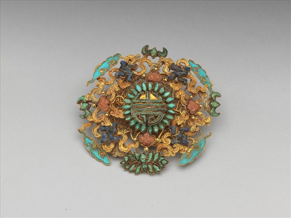 金面簪,以團壽紋為中心,由內而外裝飾纍絲綬帶地珊瑚如意雲紋、深藍色石卍字紋、點翠雲紋、綠松石蝙蝠與番蓮,在金地之上各色美石紛呈,富麗地讓人目不暇給。