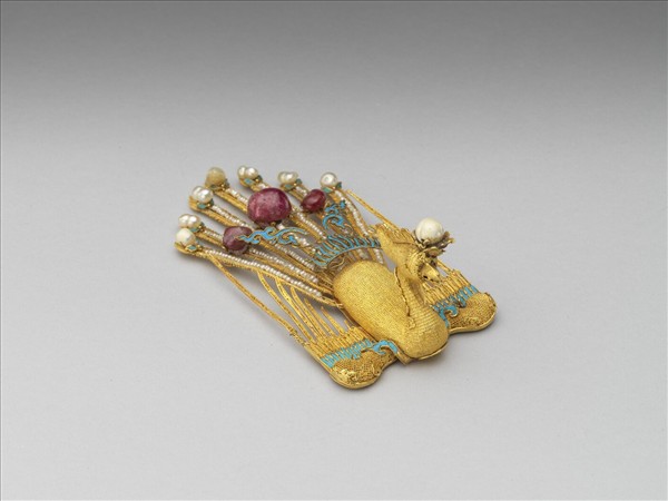 金纍絲鳳,鳳昂首前視,雙翅平展,尾部長羽展列如扇形。雙翅略飾點翠,以纍絲金黃為表現重點,尾部長羽則珠玉滿飾,表現出另一種富貴豪華之氣。