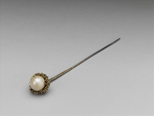 銀鍍金素鋌花針,簪首處作金屬端條狀花蕊,花蕊略內收,將鑲嵌於中心的珍珠緊緊圍繞、扣合,表現主題明確,映襯出柔潤珍珠的富貴之氣。院藏故雜4847~4848為一對。