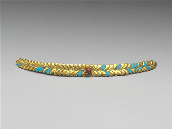 銀鍍金點翠條,全器呈長條片狀,略弧,器表琢為排列緊密整齊的兩層鱗狀葉片,其上滿飾點翠,有如具有毛茸茸紋理葉片,翠條正中央金屬蕊條略內收,緊緊圍繞、扣合鑲嵌於上紅寶石,萬「翠」叢中一點紅,非常亮眼。