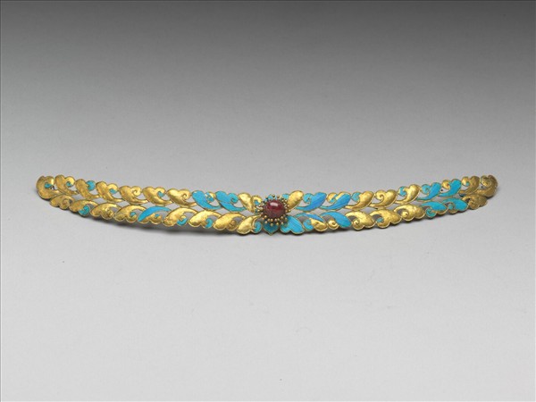 銀鍍金點翠條,全器呈長條片狀,略弧,器表琢為排列整齊的兩層卷雲狀葉片,其上滿飾點翠,翠條正中央金屬蕊條略內收,緊緊圍繞、扣合鑲嵌於上紅寶石,萬「翠」叢中一點紅,非常亮眼。