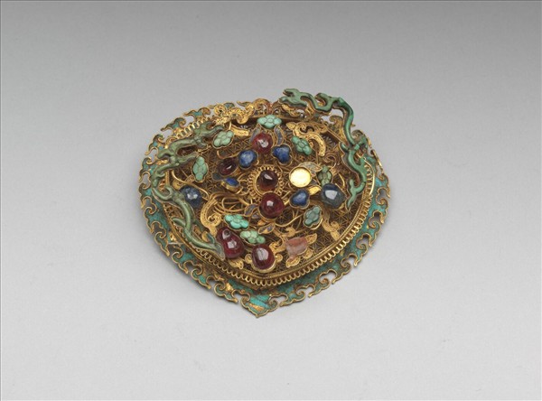 金屬片狀飾件,略近桃形,表面鏤空六瓣團花錦地,外側一圈點翠火焰紋。表面的錦地之上,黏附金屬卷枝花葉,並於其上嵌飾紅綠寶石與綠松石,寶石與金屬互相輝映,華麗又讓人目不暇給