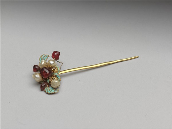尖首素鋌簪,簪首花葉,葉片點翠為飾,花心以金屬蕊緊緊圍繞、扣合紅色寶石一顆,四周嵌飾稍小的珍珠與紅色寶石。寶石、珍珠為不規則卵石狀。