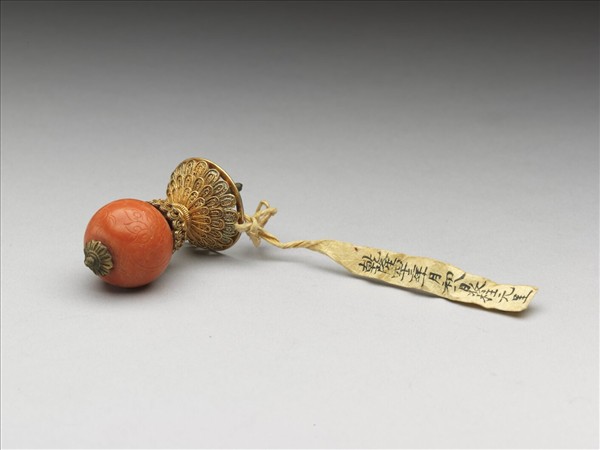 金托珊瑚帽頂,分為金屬座與座上的珊瑚圓珠。金屬座樣式略如須彌座式,以纍絲技法精製層層鏤空覆蓮瓣為飾。珊瑚圓珠表面,淺刻番蓮為飾,有如開出朵朵蔓生彎折的番蓮。