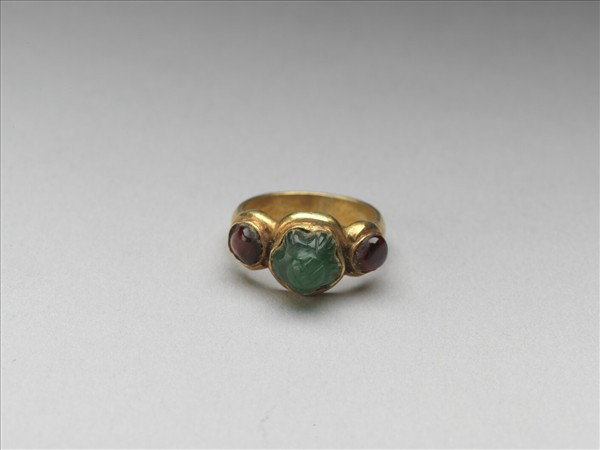 金鑲戒指,戒面中央嵌飾綠色寶石,兩側嵌略小的紅色寶石。綠色寶石以數道短陰線刻劃出類於盛開花的紋樣,紅色寶石光素無紋,突顯出寶石美好的質地。