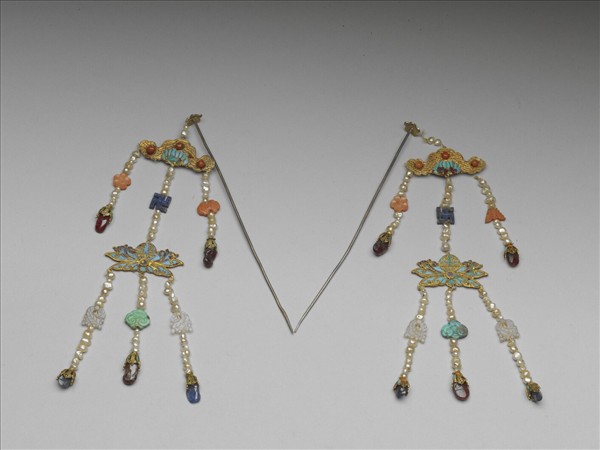 二就式。上層纍絲磬,兩邊垂流蘇,由十粒飯塊珠串成,中間珊瑚蝙蝠及珊瑚梅花,下綴點翠寶蓋內嵌紅色石;中垂十粒珠,其中間青金石卍字,下連第二就。點翠蓮花,中為團壽字,兩邊垂十二粒珠,中間玉石花葉,當中垂十粒珠,中間松石靈芝,下均綴點翠寶蓋內嵌紅、藍寶石。