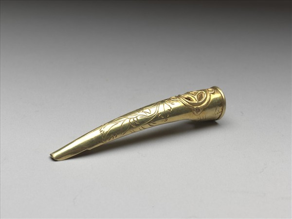 金指甲套一支,由基底往尖端漸收呈圓錐狀,順指甲形製作而略為弓起。面部刻有連枝花葉,底部鏤雕一古錢紋,古錢四方各飾一個小圓圈;底部一側刻有「半金」字樣。背部為面部金片延伸向內折曲而成,套圍大小可進行調整;除基部用以套在指尖而將金片包合,背部其餘部分均未封閉。與故雜4920為一對。