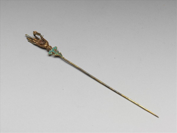 銀鍍金素鋌簪一支,器身細長。簪首呈佛手狀,拇指與食指圍成圈捻一纍絲嵌珠花籃,餘三指平伸,掌中托珍珠一顆;簪首與鋌連結處飾點翠雲紋。與故雜4923為一對。
