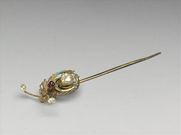 銀鍍金素挺簪一支,器身細長,簪首為蜘蛛形。頭部纍絲,金線做八腳,腹部與頭部之間嵌紅寶石一塊,腹部以點翠如意為外框、內嵌二等飯塊正珠一顆,頭部二觸鬚之末端各嵌小正珠一顆。造型精緻可愛。與故雜4932為一對。