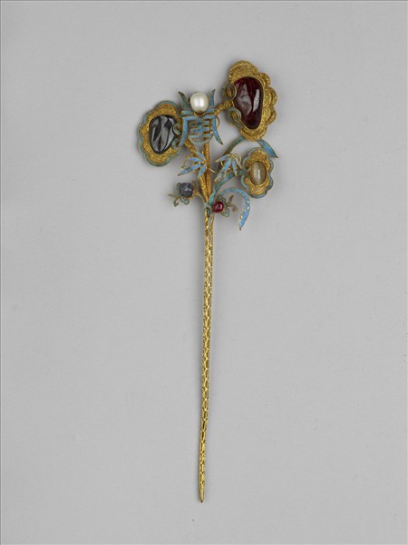 銀鍍金簪一支,挺為鏤空管狀,簪首飾以「壽」字、靈芝、松枝、竹葉等吉祥紋樣,全器形似折枝花卉。壽字點翠,上嵌無光東珠一顆;靈芝與松枝以纍絲而成,靈芝外圍與葉紋部分點翠,上嵌紅藍寶石,另有中嵌小正珠金花五朵。與故雜4934為一對,形制對稱,但所嵌寶石不盡相同。