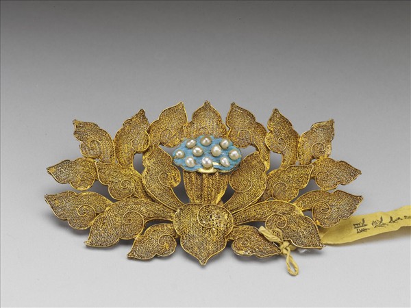 銀鍍金面簪一塊,簪面為一朵盛開纍絲蓮花,中心蓮蓬點翠,嵌碎小正珠十顆作蓮子,造型精緻大方。