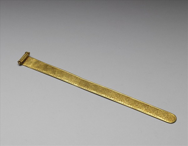 金質扁方簪一支,器身長而扁平,一端為半圓形,一端捲起。簪面鏨刻卍字不斷錦地為飾,外圍留有一道無紋細框;捲起之端兩側為花瓣形,中段有直線紋;背面光素無紋。扁方是滿洲婦女梳兩把頭時所需之特殊長簪,均作扁平一字型,使用時將扁方橫在頭頂,再以兩束頭髮纏繞其上成為一個橫髻。
