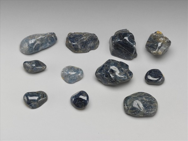 不規則形藍寶石一塊,呈藍色,可見內部天然結晶紋理。故雜4983至故雜4993以上拾壹塊裝成壹包。本批藍寶石由原石切割成大小不一塊狀,多已打磨光滑,留待製作用品或飾物。