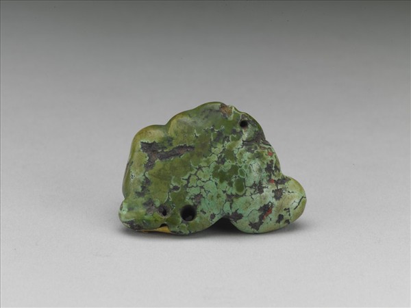 不規則形松石一塊,呈綠色,夾雜黑褐色斑塊及網絡狀紋理,有小孔。表面略經打磨,留待製作用品或飾物。松石為綠松石或松綠石之簡稱,質地細膩、色澤溫潤,中國多地出產。