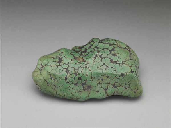 不規則形松石一塊,呈綠色,密佈黑褐色網絡狀紋理。表面略經打磨,留待製作用品或飾物。松石為綠松石或松綠石之簡稱,質地細膩、色澤溫潤,中國多地出產。