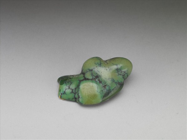 不規則形松石一塊,呈綠色,夾雜黑褐色網絡狀紋理,有小孔。表面略經打磨,留待製作用品或飾物。松石為綠松石或松綠石之簡稱,質地細膩、色澤溫潤,中國多地出產。