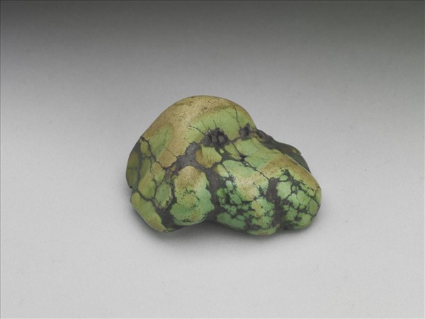 不規則形松石一塊,呈綠色,夾雜黑褐色斑塊及網絡狀紋理,有小孔。表面略經打磨,留待製作用品或飾物。松石為綠松石或松綠石之簡稱,質地細膩、色澤溫潤,中國多地出產。