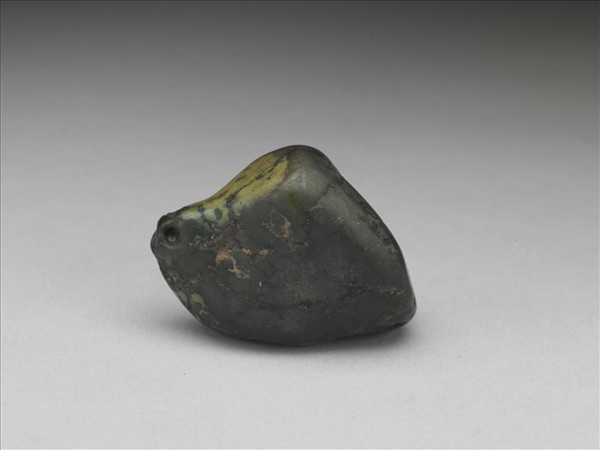 不規則形松石一塊,呈綠色,夾雜黑褐色網絡狀紋理,有小孔。表面略經打磨,留待製作用品或飾物。可能由於受到曝曬或污染等因素,使得表面變成墨綠色。松石為綠松石或松綠石之簡稱,質地細膩、色澤溫潤,中國多地出產。