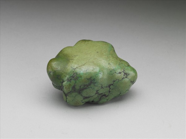 不規則形松石一塊,呈綠色,夾雜黑褐色網絡狀紋理,有小孔。表面略經打磨,留待製作用品或飾物。松石為綠松石或松綠石之簡稱,質地細膩、色澤溫潤,中國多地出產。